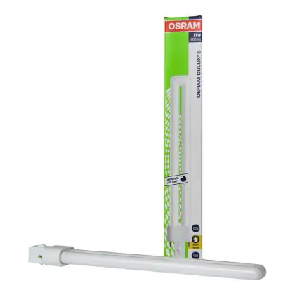 Each compact fluorescent lamp of this range has a base type G23 with 2 metal pins. Osram DULUX S 11W/830 G23 Lumilux Warm Whitelamps have a size of 23.7 cm.